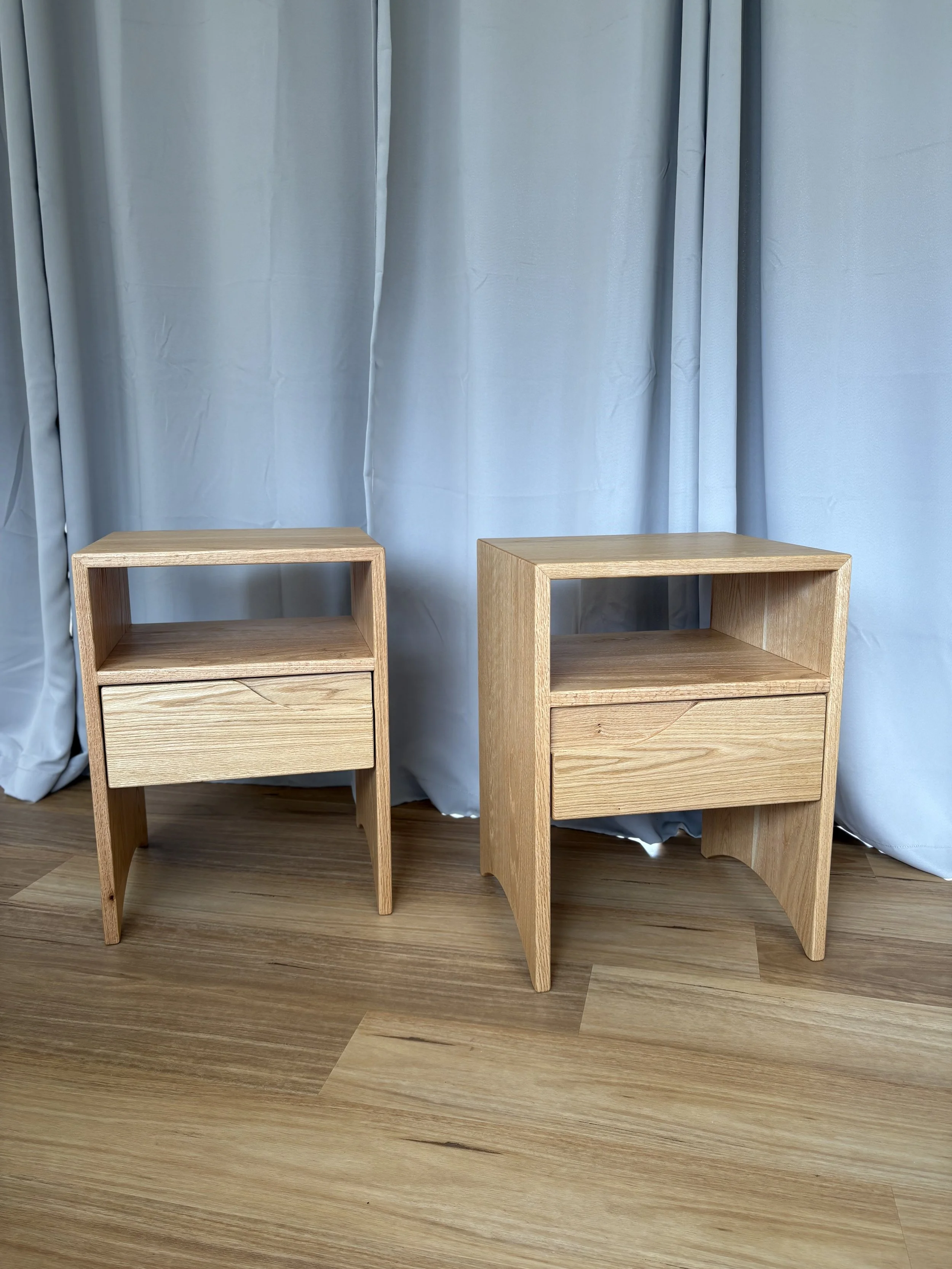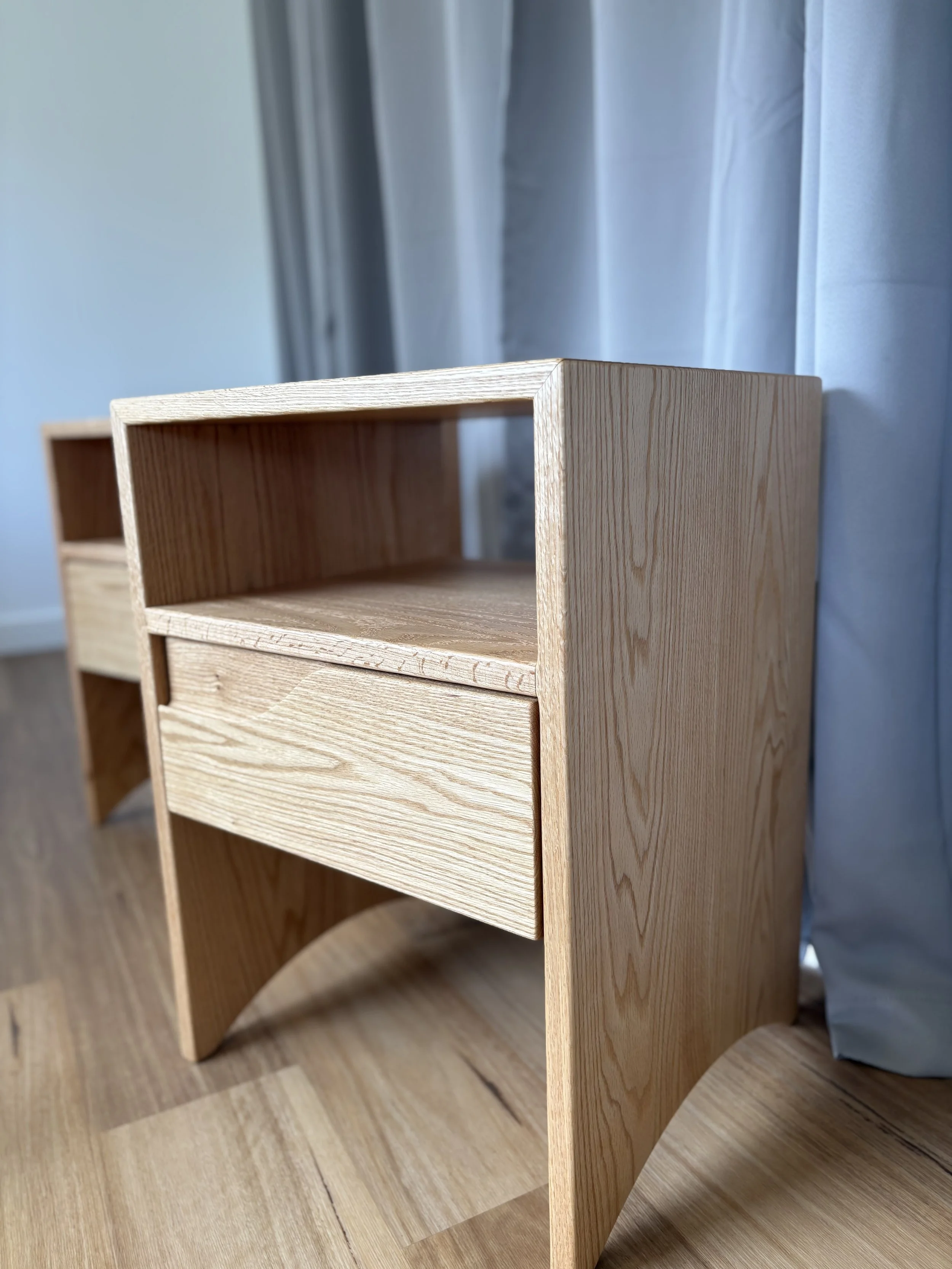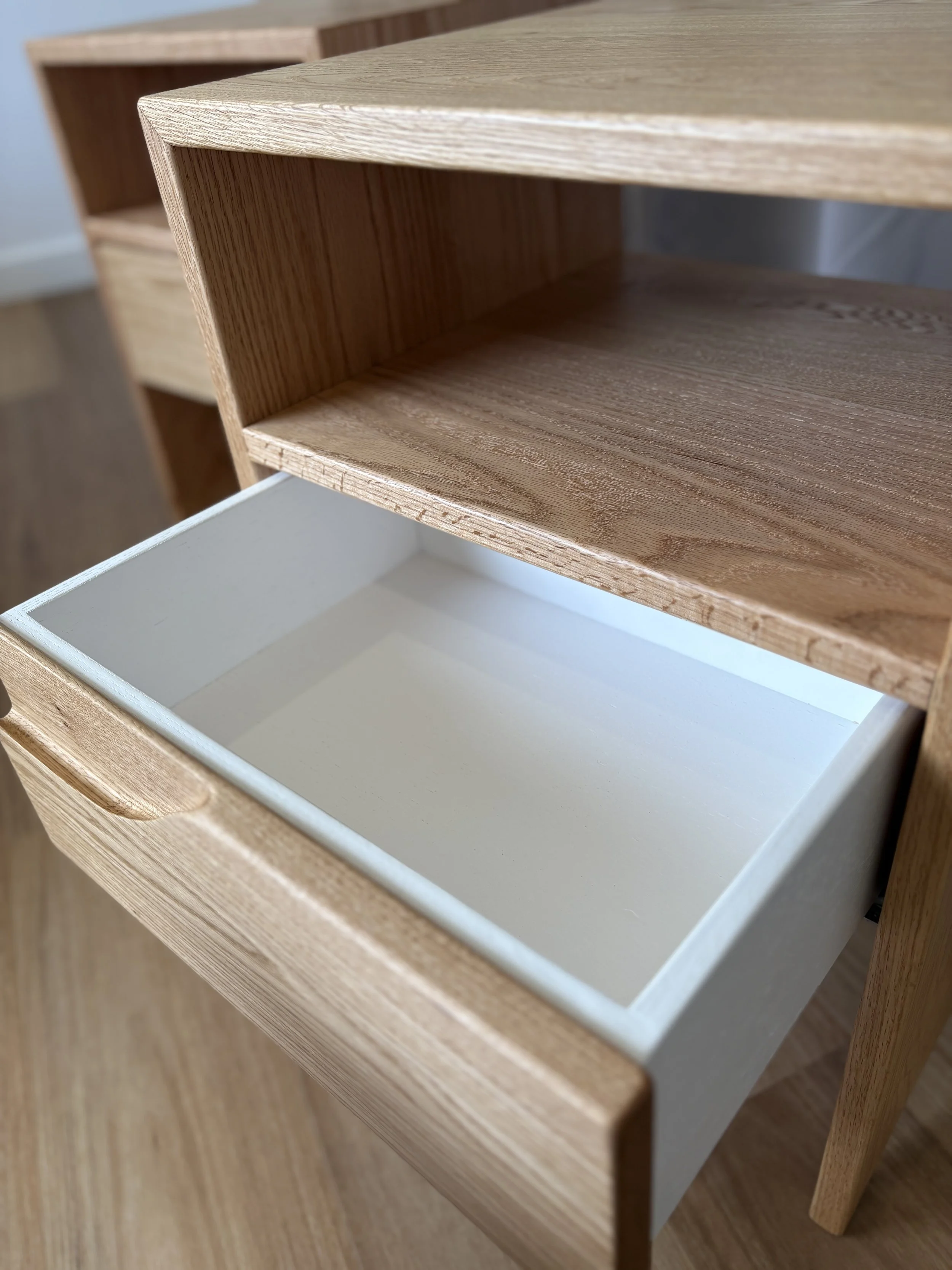Crafted in American Red Oak, this pair of bedside tables showcases precision joinery, smooth drawer action and a natural finish that highlights the timber’s rich grain. A custom build designed for both beauty and longevity.