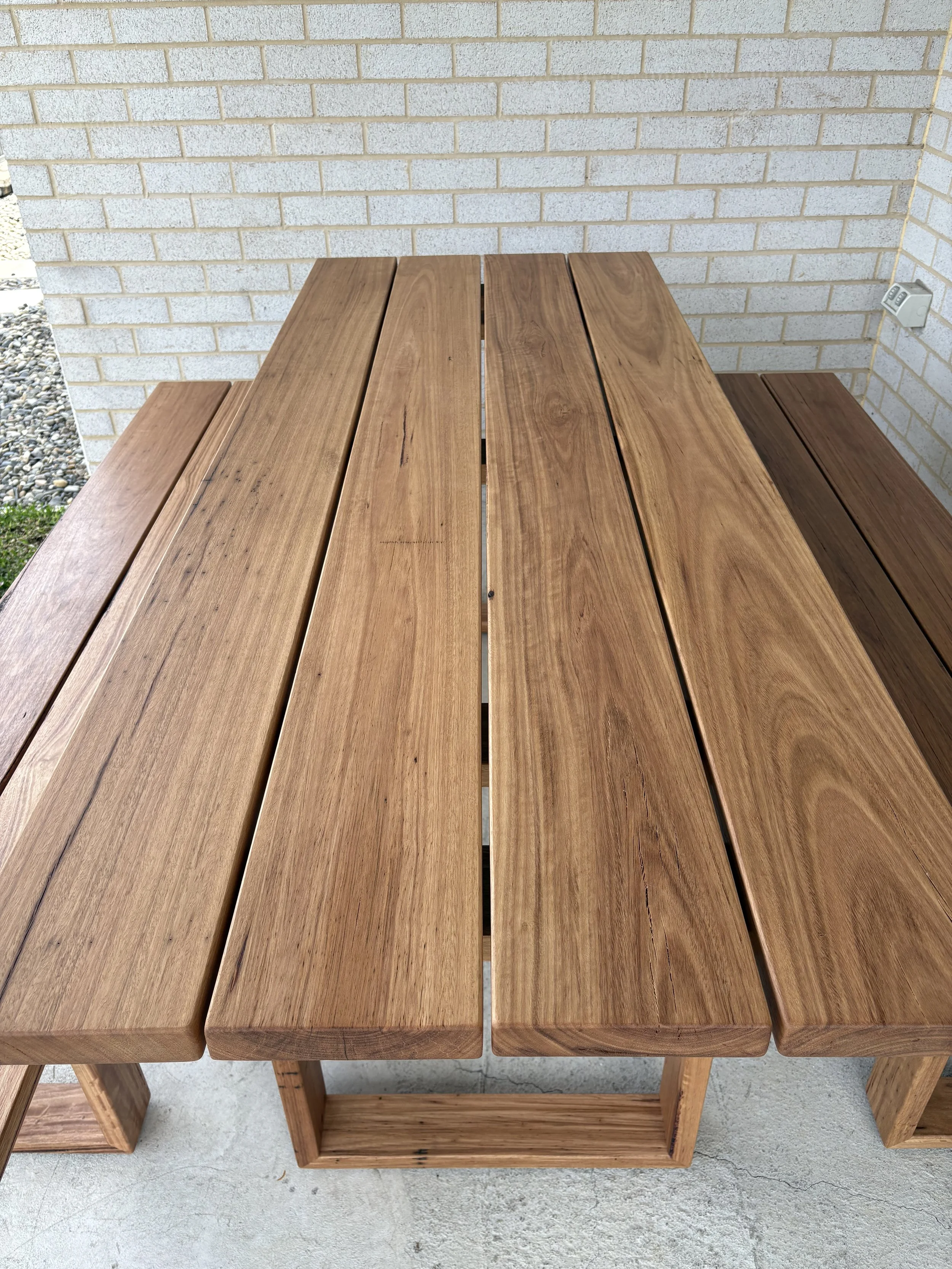 Crafted from sustainably sourced solid blackbutt hardwood, this outdoor setting combines natural strength with timeless design. Built with 316 stainless steel fixings for lasting durability and finished in Osmo UV oil to protect against the elements and enhance the wood’s natural beauty.